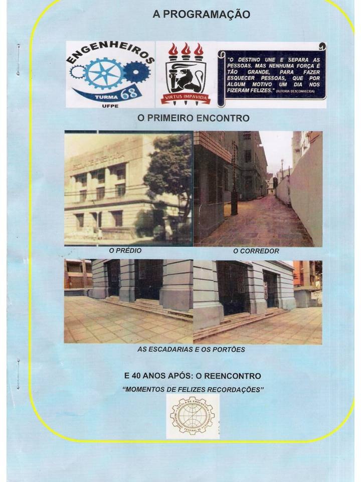 - Abertura pelo Mestre de Cerimônia (com breves palavras sobre o Reencontro dos engenheiros, formandos de 1968 da UFPE). Chamada para a composição da mesa (pelo Mestre de Cerimônia) que deverá ser composta das seguintes autoridades e nesta ordem: Profº' Amaro Henrique Pessoa Lins, Magnífico Reitor da UFPE, Profº Edmilson Santos de Lima, Diretor do Centro de Tecnologia e Geociências da UFPE, Profº Ruy José Victor Martins Saldanha, Paraninfo da Turma, e ainda do Prof'º Jaime de Azevedo Gusmão Filho (Homenageado da turma de Civil), Profº Solon Medeiros Filho (homenageado da turma de Eletricidade), Profº Antônio Carlos Maranhão de Aguiar (homenageado da turma de Mecânica), Profº Álvaro Alves Camello (homenageado da turma de Minas), do Coordenador Geral dos Eventos do Reencontro da Turma de 1968, Engº Bemardo de Oliveira Campos e do Presidente da Comissão Organizadora, Engº Bartolomeu de Albuquerque Franco.
