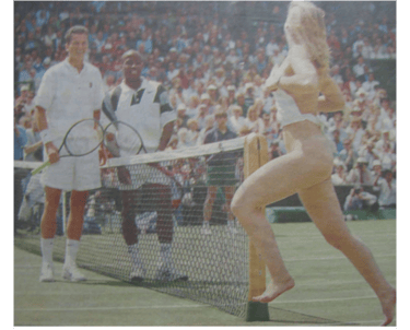 Vimos Sampras, Agassi, Becker, Kafelnikov e outras feras do tênis, mas, a final foi Krajycec e Washington. Um árbitro amigo de Beto e Denise conseguiu um local na segunda fila do estádio. Hingis foi finalista, aos 14 anos, perdendo para Graf. A garota que entrou pelada no estádio passou a 10 cm do meu nariz. Eu só falei: “Furtuna, não me peça pra não olhar”.
